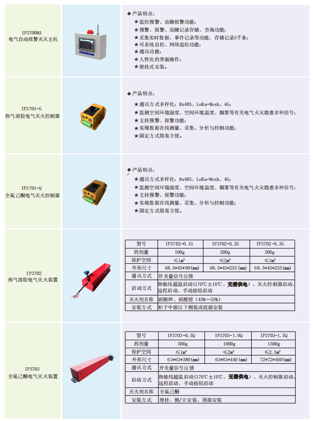 IP3703全氟己酮電氣滅火裝置是新型環(huán)保、高科技、綠色消防產(chǎn)品,是內(nèi)置于儲能電池簇、配電柜、高壓開關(guān)柜、精密機(jī)房配電柜等場景的自動滅火裝置,可通過自帶的溫度敏感元件啟動,也可通過電氣滅火系統(tǒng)電信號觸發(fā)啟動。產(chǎn)品采用絕緣、環(huán)保的全氟已酮滅火藥劑,具有無色、無味、無毒、不導(dǎo)電等特點,不會對被保護(hù)設(shè)備造成二次傷害。同時,該裝置采用先進(jìn)的密封技術(shù)和自動控制技術(shù),能夠保證長年不泄漏,實現(xiàn)快速響應(yīng)和精準(zhǔn)滅火,可有效撲滅電芯熱失控引發(fā)的早期鋰電池火災(zāi),并起到對保護(hù)區(qū)域?qū)崿F(xiàn)快速降溫和持續(xù)抑制復(fù)燃的作用。全氟己酮滅火劑具有良好的滅火效果,其機(jī)理是通過物理和化學(xué)兩方面的作用滅火,全氟己酮液體高速霧化噴出后,遇熱氣化,由于氣化熱容量大,具有較強的吸熱能力,使火焰快速失去熱量,全氟己酮比重大,在懸浮下落的過程中,火焰周邊可以隔絕空氣中的氧氣,可以捕捉燃燒鏈?zhǔn)椒磻?yīng)的自由基,終止火焰?zhèn)鞑サ逆準(zhǔn)椒磻?yīng)。全氟己酮滅火裝置具有滅火效率高、環(huán)保潔凈、使用安全、絕緣性能好、對電子精密設(shè)備無損傷等綜合優(yōu)勢,可撲救A、B、C、E各類火災(zāi),應(yīng)用于全區(qū)域或局部區(qū)域滅火,尤其適用于車輛電控柜、精密設(shè)備、精密機(jī)房配電柜、有人工作但又較為封閉的場所。