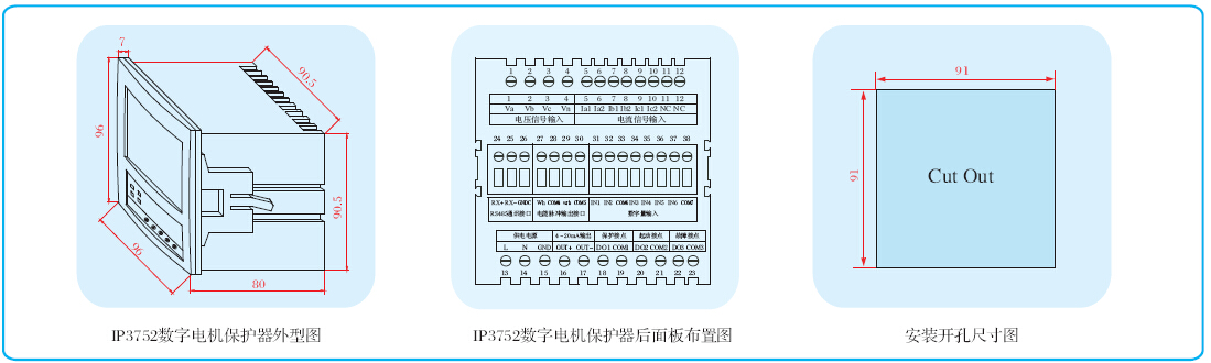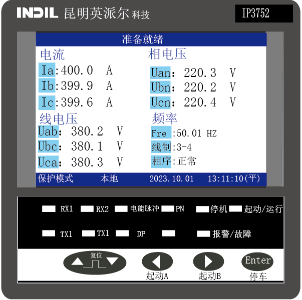 IP3752數字電機保護器(以下簡稱保護器)主要用于保護交流電壓380V,頻率50Hz,電流1000A以下的各種交流電機。具有過載、堵轉、輕載、不平衡/缺相、過壓/欠壓、短路、接地等故障保護功能,并有最大允許分斷電流保護以及全參數測量(包括三相電壓/電流、接地電流、有功/無功功率、功率因數、頻率、有功和無功正/負電能和不平衡率等參數)、操作控制、遠程通訊等功能。其采用互感器與主體分離的電流輸入方式,需配合專用或通用CT模塊一起使用。