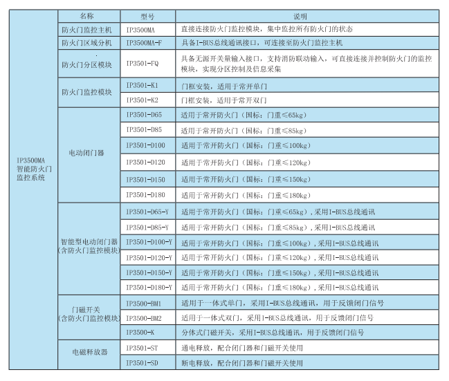 IP3500智能防火門監控系統包括IP350OMA防火門監控器 、 IP350OMA-F防火門區域分機 、 IP3501 -FQ防火門分區模塊 、 IP3501系列防 火門監控模塊 、 電動閉門器 、 門磁開關 、 電磁釋放器等 。實時監測防火門的狀態信息 。